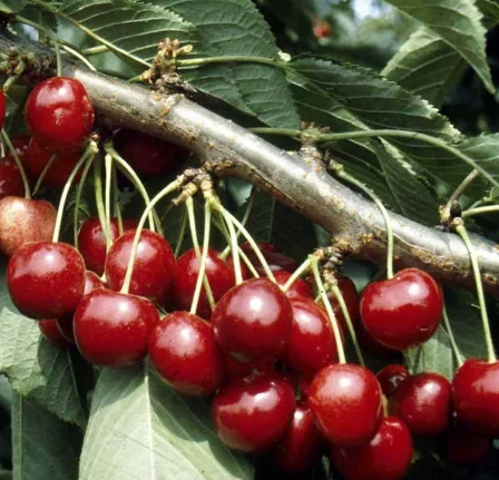 - Kirsebærrene er store, hjerteformede og lysende røde, med fast og sprødt frugtkød.