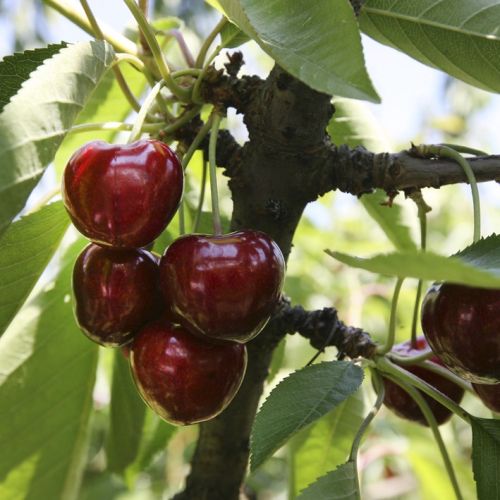 - Kirsebærrene er store, mørkerøde og hjerteformede, med fast og saftigt frugtkød.